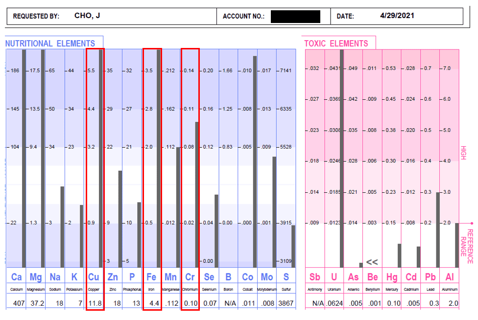 他表现出吃肝过多的所有迹象。他的铁、铜和铬含量很高。凡是吃肝过剩的东西。矿物质相互对抗和协同作用。我们喜欢看到锌:铜的比例为 8:1。我的客户铜多于锌。需要锌来产生盐酸(胃酸)来分解胃中的肉,然后在小肠中吸收营养。