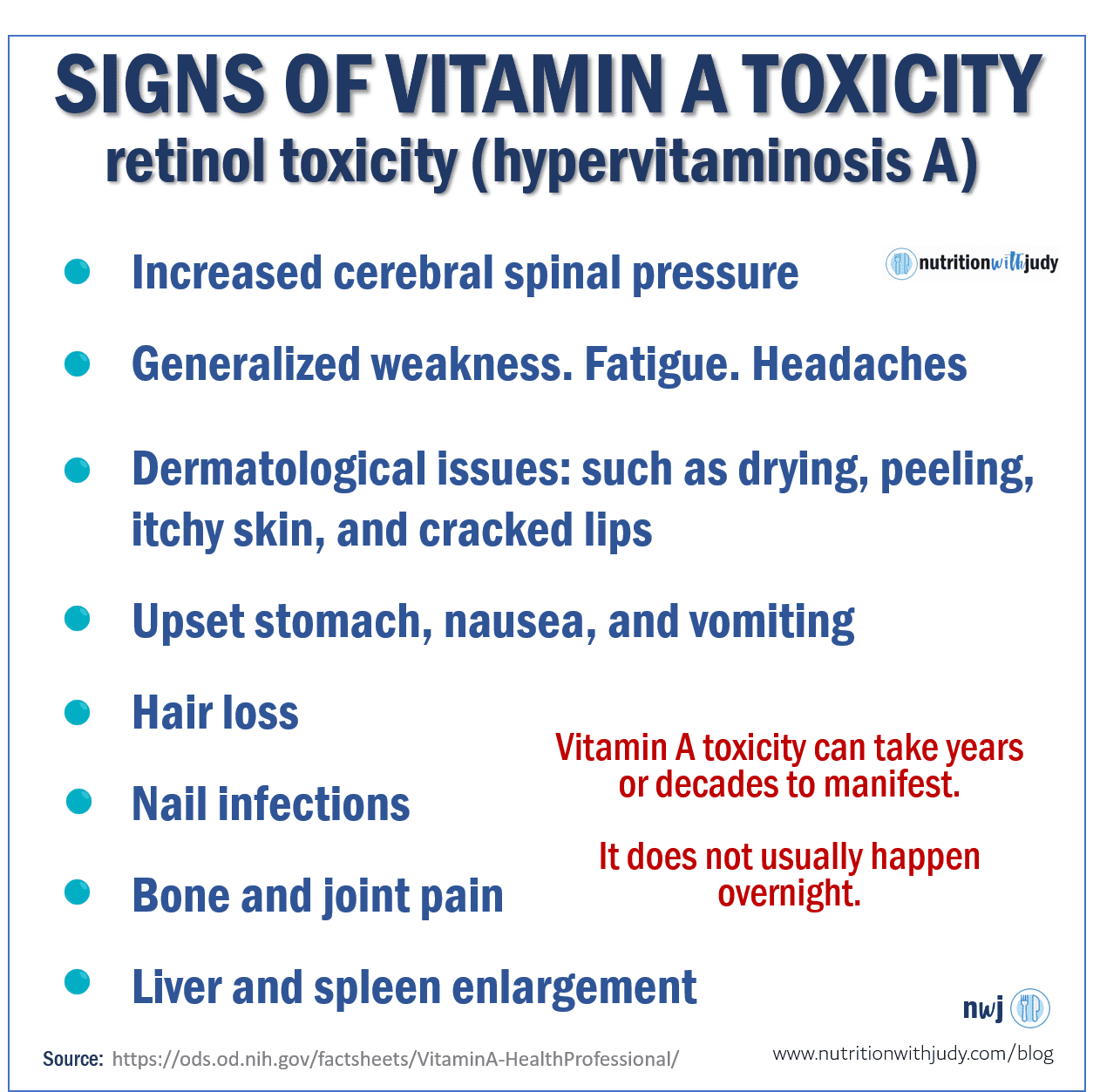 …越来越多的证据表明,超过营养需求的维生素 A 剂量可能会导致负面后果,包括生物能量状态功能障碍、氧化还原损伤、细胞信号改变以及细胞死亡或增殖,具体取决于细胞类型。长期以来,神经毒性已被证明是不慎食用的可能副作用,甚至在医学建议下服用中等至高剂量的维生素 A 和类维生素 A。(来源