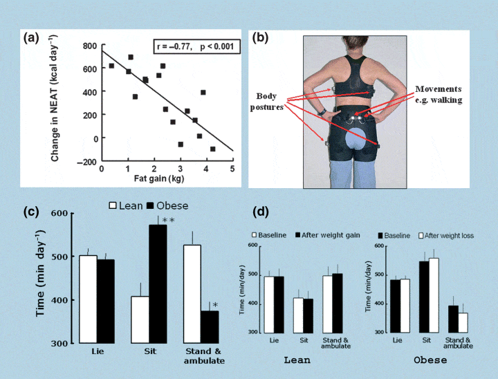 发现 NEAT 的科学家詹姆斯·莱文 (James Levine)做了一项小型研究,该研究于 2005 年发表在《科学》杂志上,受试者穿着莱文所说的“烦躁裤”,也就是带有运动检测传感器的内衣。