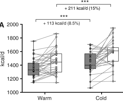 甲减者的代谢往往比甲状腺功能正常的人慢。在温暖的温度下,差异约为 8%。在轻度寒冷的情况下,大约有 15% 的差异。当甲减症消失后,寒冷引起的生热作用会加倍(R)。